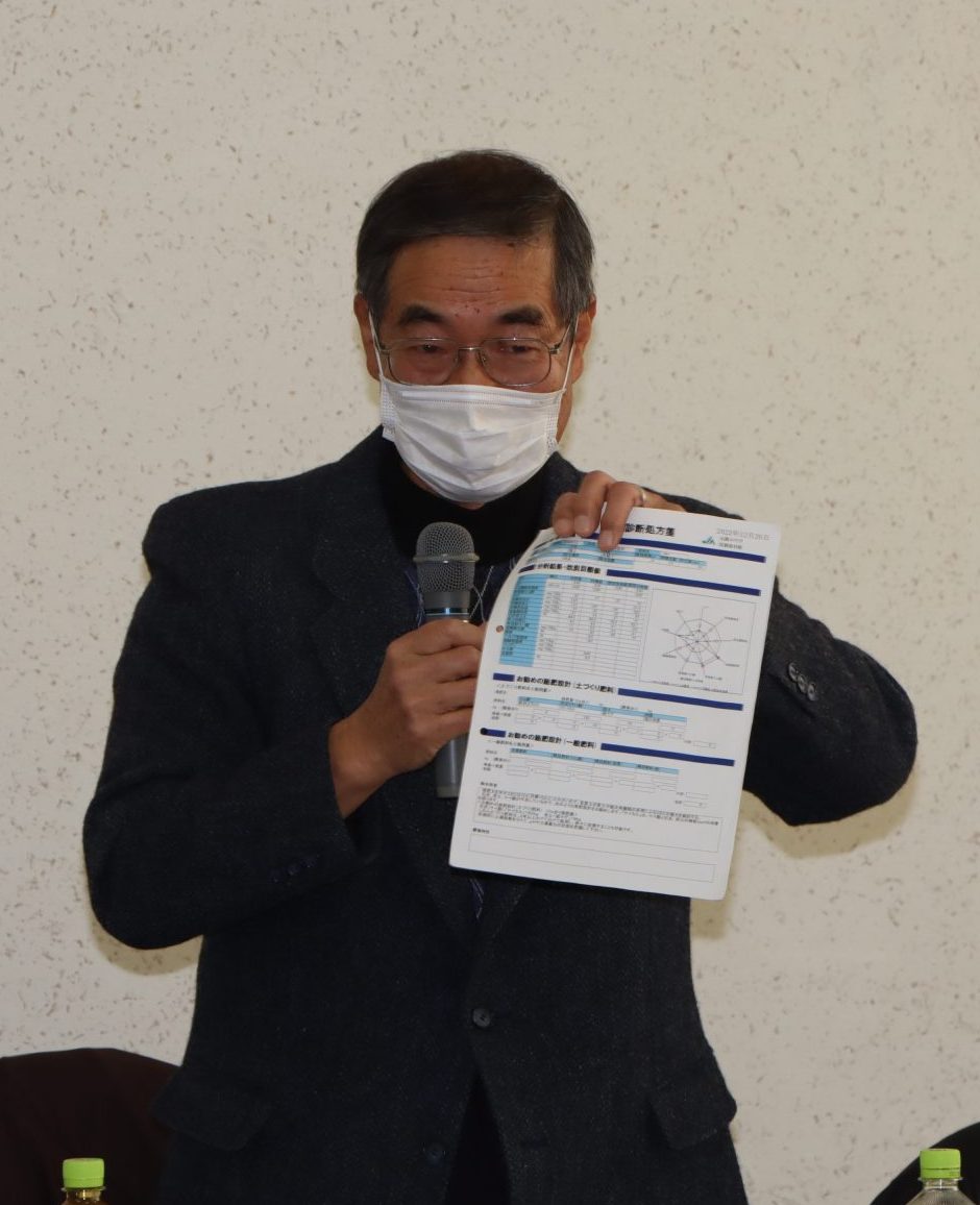 検討会では、同会のアドバイザーを務める元東北大学の教授で土壌学を専門としていた管内在住の南條正巳さんが、結果を踏まえ解説。「生育のむらは、圃場整備による土壌の切り盛りが関係していると考えられる。全体的にリン酸値が目標値より低いので、リン酸肥料を投入してはどうか」と話しました。