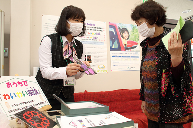 4月16日、4支店で新年度最初のJA古川型福祉活動「支店でわいわい茶論(さろん)」を開きました。コロナ禍により「おうちでわいわい茶論」とし、自宅で楽しめる脳トレ問題集や切り絵の制作キットを来店者に配付ましした。年金支給日に合わせて開催しており、楽しみにしているリピーターも増えています。今年度はコロナ感染対策を講じながら、自宅でできる脳トレや健康体操などの情報提供と簡単な手芸キットを配付する計画です。来店者は「いつも楽しみで欠かさずに来ている。様々な手芸は地域の集まりでも生かせるのでありがたい。今後も続けてほしい」と笑顔で話していました。