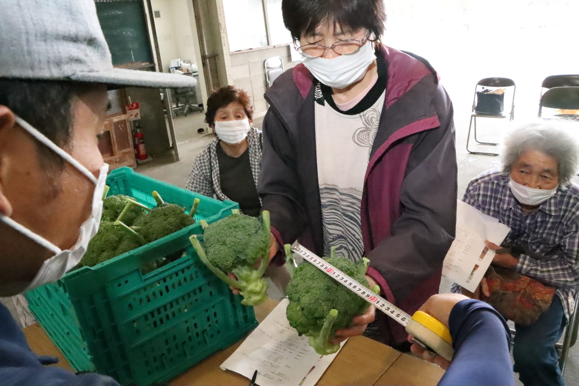 JAは6月9日、三本木野菜集出荷場でブロッコリーの出荷目揃い会を開きました。JA担当職員が出荷形態や規格について調整を実演しながら説明しました。