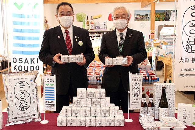 大崎の米「ささ結」ブランドコンソーシアムは4月27日より、「大崎耕土」世界農業遺産ブランド認証米「ささ結」の真空パック無洗米キューブの販売を開始しました。市内の道の駅や土産店などで販売し、お手軽なキューブタイプの利点を生かして全国にPRしていきます。 同日、道の駅おおさきで商品のお披露目会を開き、コンソーシアム代表の伊藤康志大崎市長と佐々木琢磨組合長が商品を発表しました。佐々木組合長は「食味・品質に重点を置き、安全安心な環境に配慮した生産をしている。真空パックなので鮮度が長持ちする。ぜひ多くの消費者に購入してもらいたい」と話していました。伊藤市長は「無洗米なので、お土産や贈答用だけでなく、災害時の備えや3密を避けた野外でのキャンプでも手軽に食べてほしい」とPRしました。 この商品は、コロナ禍により米の消費が落ち込む中、「ささ結」の認知度向上と消費拡大を図るためにコンソーシアムが企画し、JA古川が販売しているもの。1パック300グラム入りで標準小売価格450円(税込)。JA管内で生産された「ささ結」を100%使用しており、パッケージには世界農業遺産「大崎耕土」のWebサイトにつながるQRコードを記載しています。 現在の販売場所は同市内の道の駅おおさき、道の駅三本木やまなみ、あ・ら・伊達な道の駅、観光物産センター土蔵(Dozo)、JA生活課で、今後は同市のふるさと納税返礼品にも登録し、全国に発信していきます。