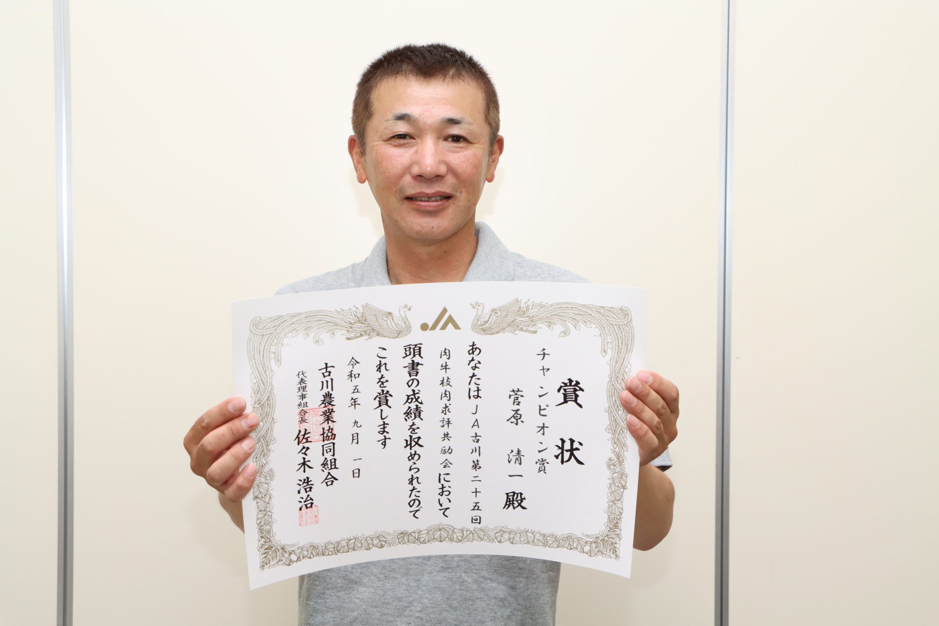 JA肉牛部会は9月1日、東京中央食肉卸売市場で第25回肉牛枝肉求評共励会を開き、東大崎の菅原清一さんがチャンピオン賞を受賞しました。