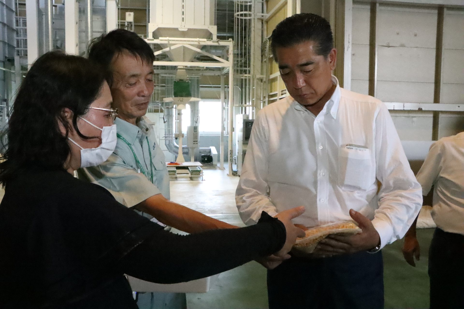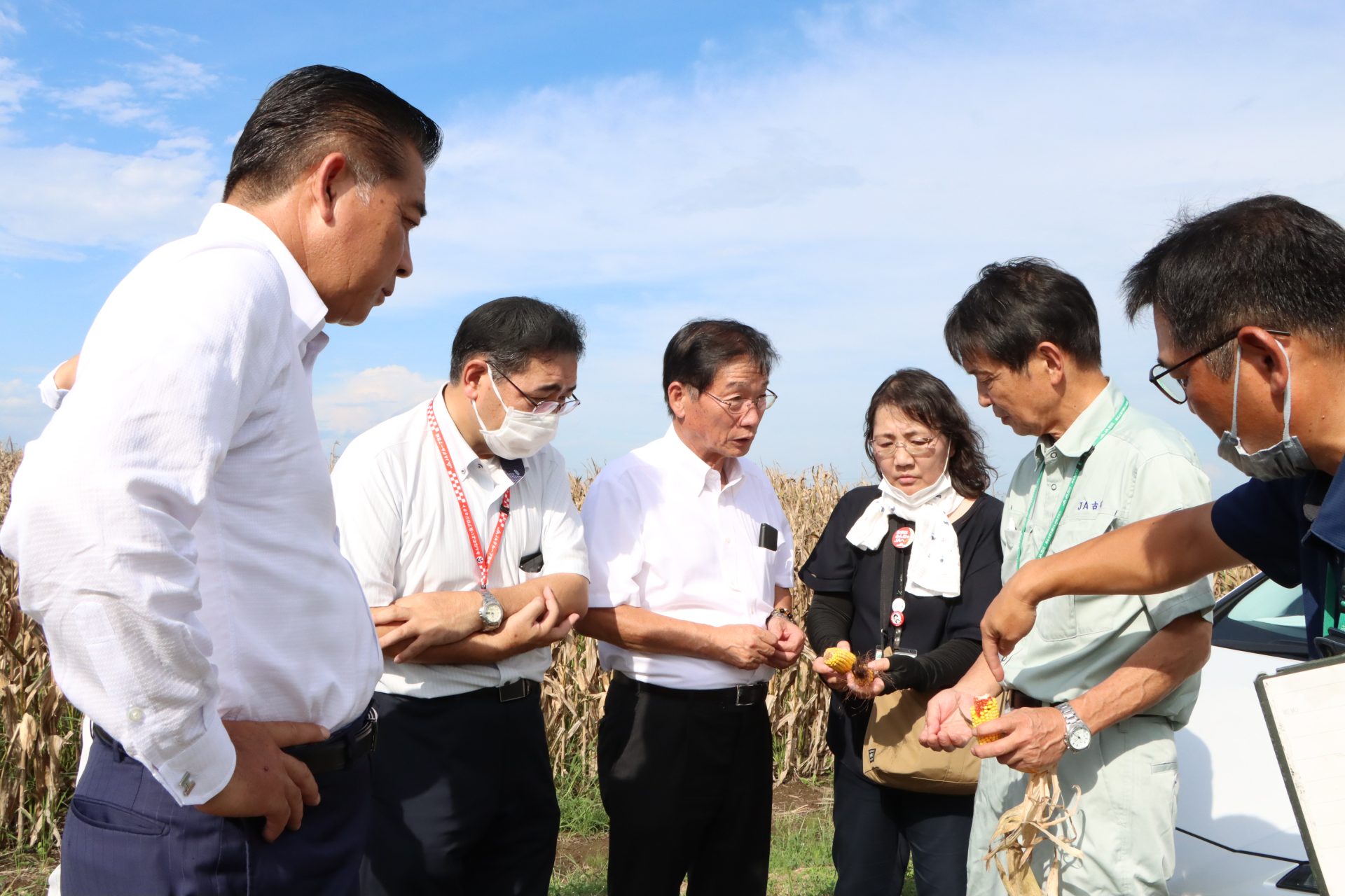 JA古川は9月19日、藤木眞也参議院議員や全農みやぎの職員らと共に、大崎市敷玉にある子実とうもろこしや大豆の圃場(ほじょう)で生育状況を視察しました。視察後はJA宮城中央会の佐野和夫会長、JAの佐々木浩治組合長らと意見交換をしました。