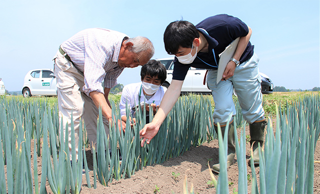 ねぎ部会は6月11日、管内で巡回指導会を開き、生育状況の確認と今後の管理を指導しました。この日はJA担当職員と同部会長、大崎農業改良普及センターの担当者が2班に分かれ、管内19の生産者の圃場を巡回しました。講師を務めた普及センターの担当者は「今年は気温が高く、乾燥ぎみで、害虫の被害が多い。防除を徹底することと、土あげの際は追肥をし、肥料切れを起こさないように」と指導しました。また、梅雨に入り作業ができなくなる前に除草作業をしっかり行うよう呼び掛けました。 生産者は「生育は順調。害虫だけでなく、病気の予防も徹底して行い、品質のよいものを出荷したい」と話していました。