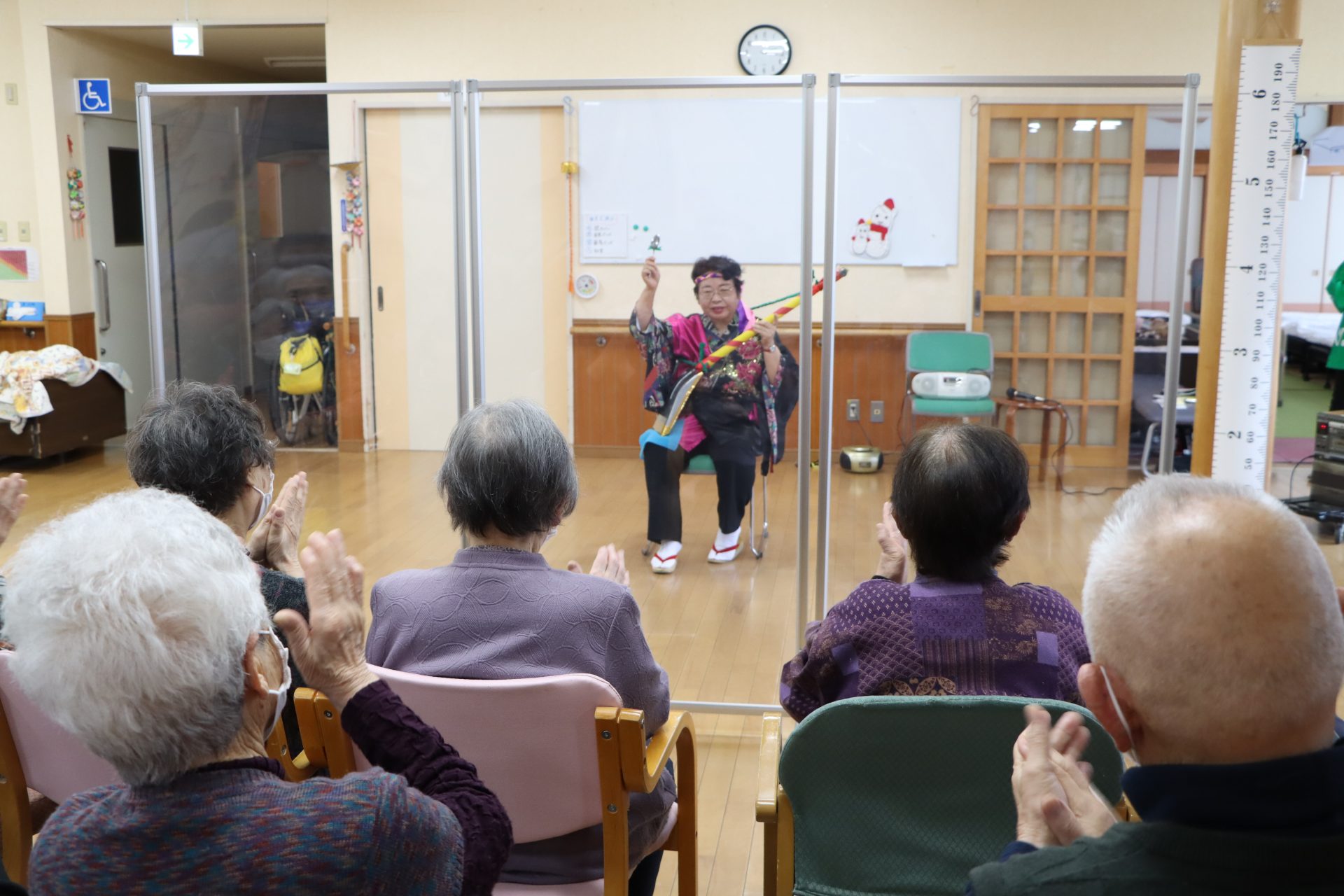 女性部10人が参加し、フラダンスや日本舞踊のほか、簡単な手足の運動やスコップ三味線を披露。利用者は手拍子をしたり、一緒に歌を歌って楽しんでいました。