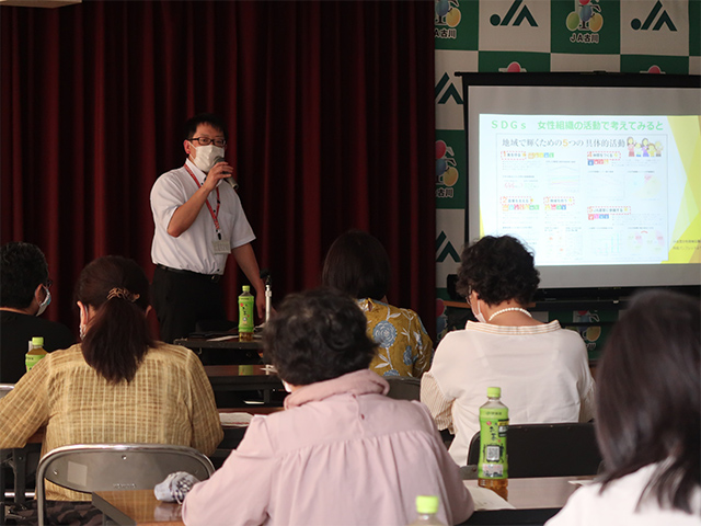 女性部は7月2日、JA本店で学習会を開き、女性部活動とSDGsの関わりについて学びました。講師はJA宮城中央会組織対策部の鈴木圭将さんが務め、「SDGsの取り組みについて」と題し講演しました。鈴木さんはSDGsとJA、女性組織の関わり、事例などを紹介。「今日SDGsを初めて聞いた方は一つでも理解いただき、それを今後の活動に生かしてほしい」と呼び掛けました。三塚俊枝女性部長は「SDGsは女性部活動そのもので、持続可能な社会は私たちの未来であり子や孫の未来です。これからも仲間とともに活動を進めていきましょう」と挨拶しました。