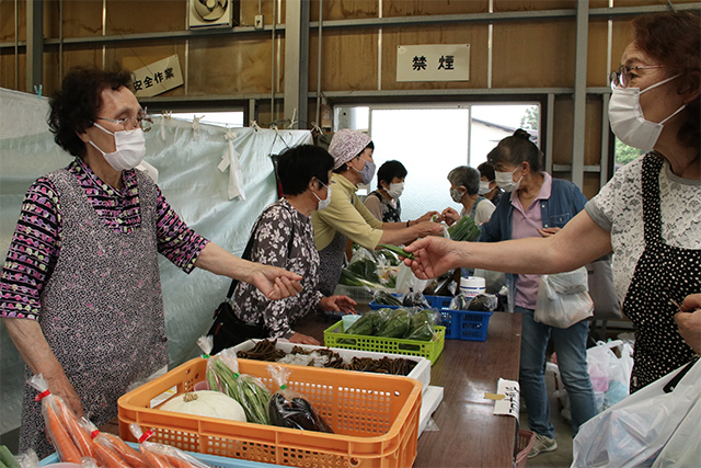 女性部は7月7日、農産物直売所「ばんがた市」の営業を開始。12月まで新鮮な野菜などを販売しています。JA宮沢給油所向かいにあるJAの空き倉庫を利用し、毎週水曜の午後3時〜4時(10月~12月は午後2時〜3時)に営業。現在は会員13人が取れたての野菜や生花、漬物などを販売しています。 来店者は「新鮮でおいしい野菜があるので、毎年買いに来ている。皆さんの顔を見られるのも楽しみの一つ」と笑顔で語ります。代表の宮﨑一子さんは「消費者と生産者のコミュニケーションを大切にしている。朝取りの新鮮野菜を手頃な価格で提供しているので、ぜひ買いに来てほしい」と話していました。