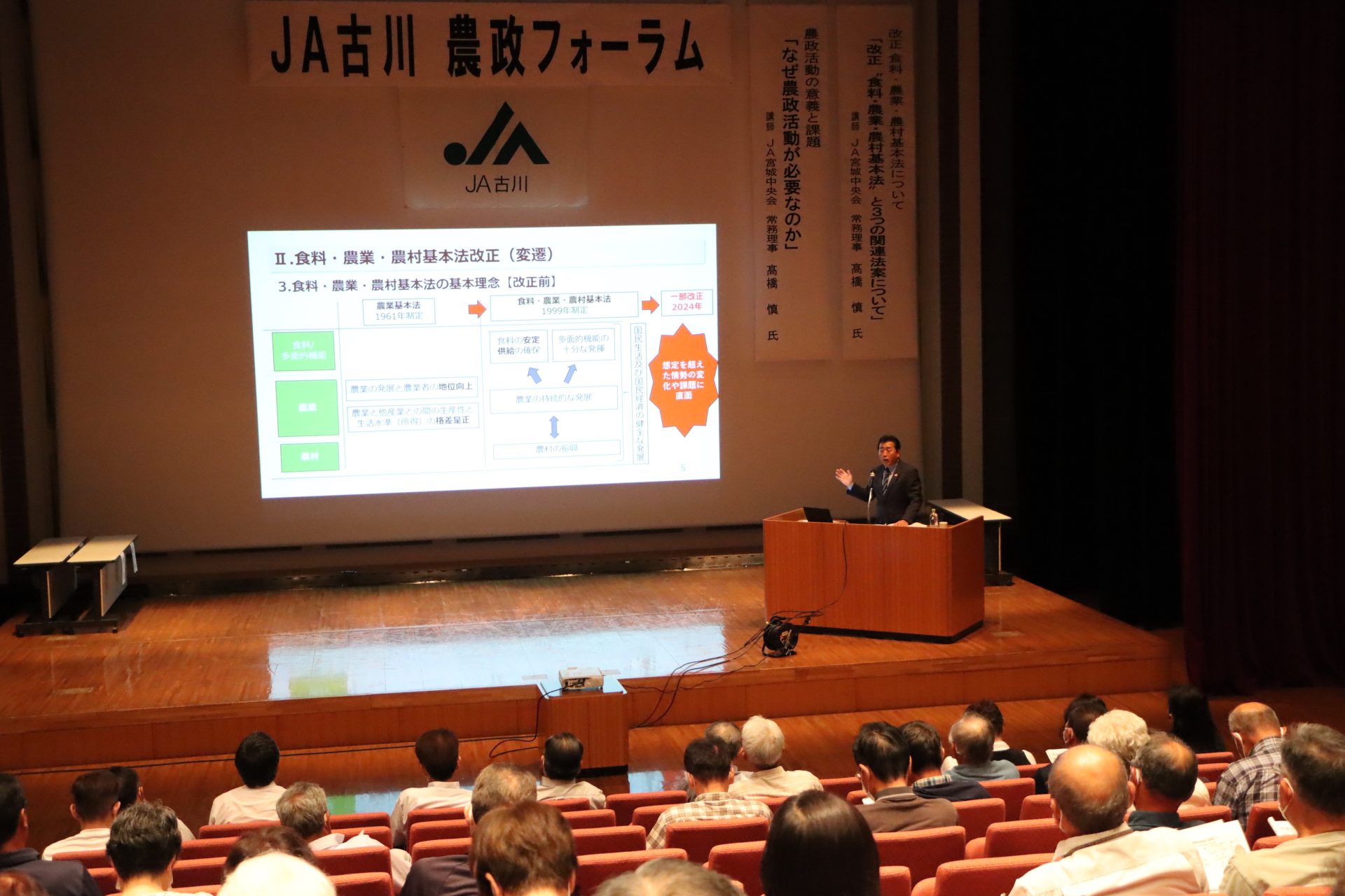 JAは6月11日、日本の農政が重要な局面を迎えていることを踏まえ、農政について学ぶため、パレットおおさきで「JA古川農政フォーラム」を開きました。改正された食料・農業・農村基本法と、農政活動の意義について学びました。
