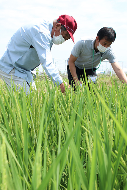 「五百川」の出穂を確認するJA職員(右)と岩崎さん