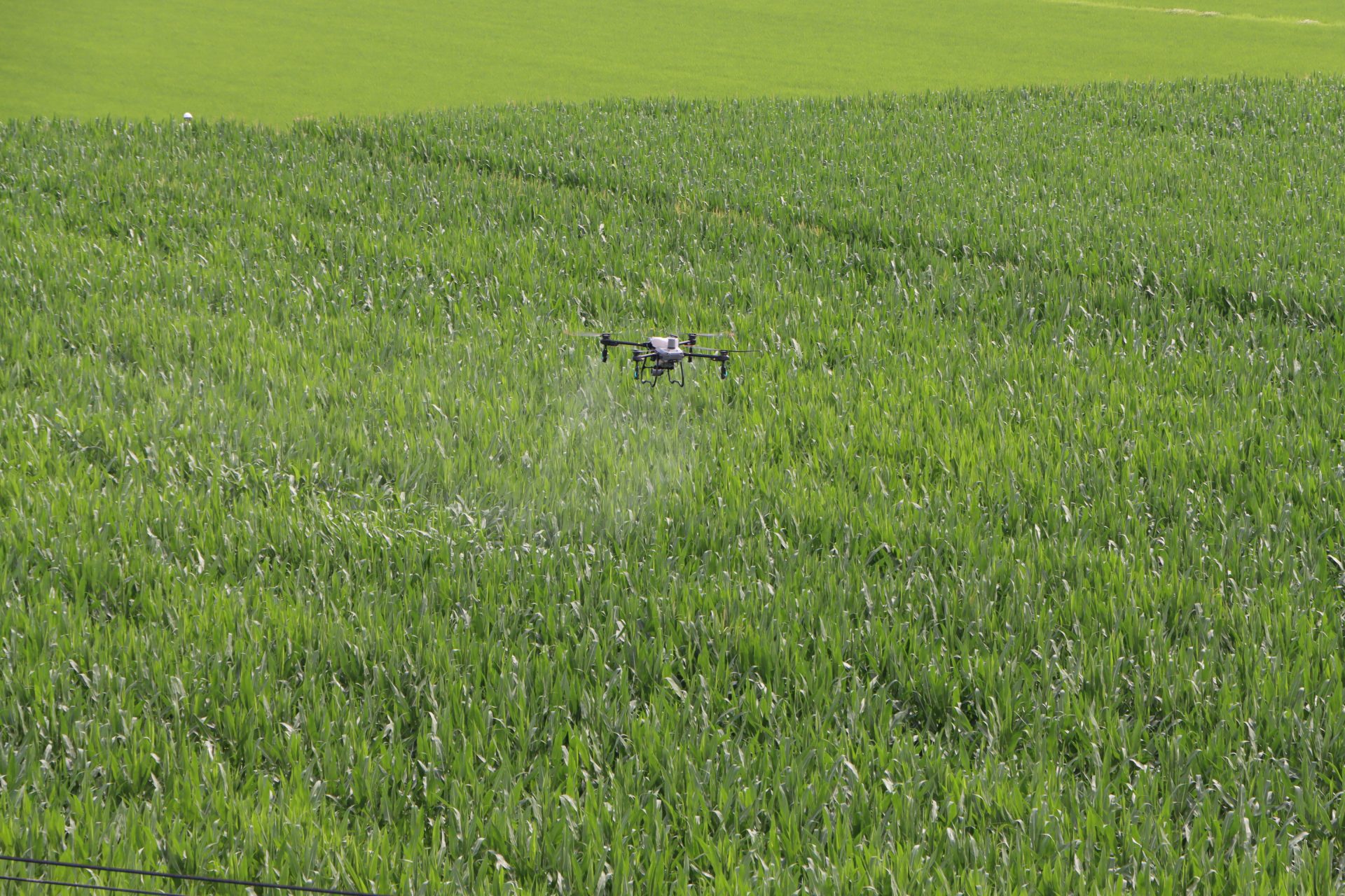 農薬散布ドローン「DJI・T25」を4機使用し、アワノメイガ防除に効果がある「プレバソンフロアブル5」を上空から散布しました。