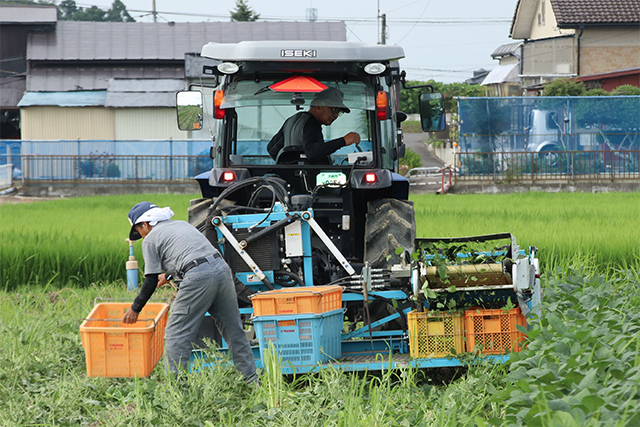 7月24日、管内で転作エダマメの収穫が始まりました。作業をした高倉地区の門脇敏二さんは「エダマメは4年目の栽培だが、今年は天候に恵まれ圃場条件が良く、莢もきれいで例年以上に良いできになった」と手応えを話します。 同日、機械で収穫したのは約30アールに作付けした極早生種「神風香」。食味を重視し、まだ気温が上がらない早朝からの作業となりました。JAの園芸担当職員は「9月15日頃から始まる『つきみ娘』や『秘伝』をメインに9月末まで収穫作業が続く見込み。適期収穫を呼び掛け、A品率向上を目指したい」と話していました。