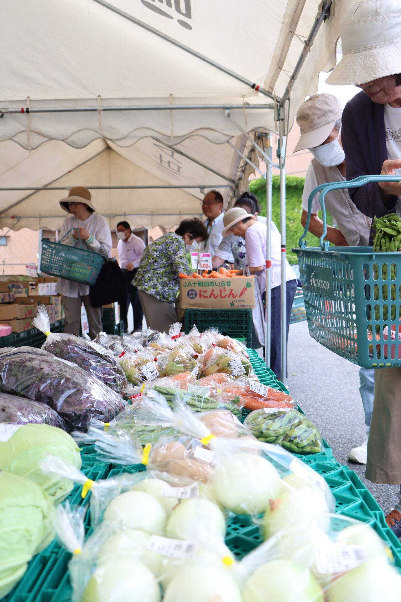 同店の朝市と同時開催し、店舗前に設置したテントで、会員が管内で栽培した朝採り新鮮野菜を中心に販売。ピーマン、キャベツ、トマトなど数多くの商品が陳列され、来店者で賑わいました。