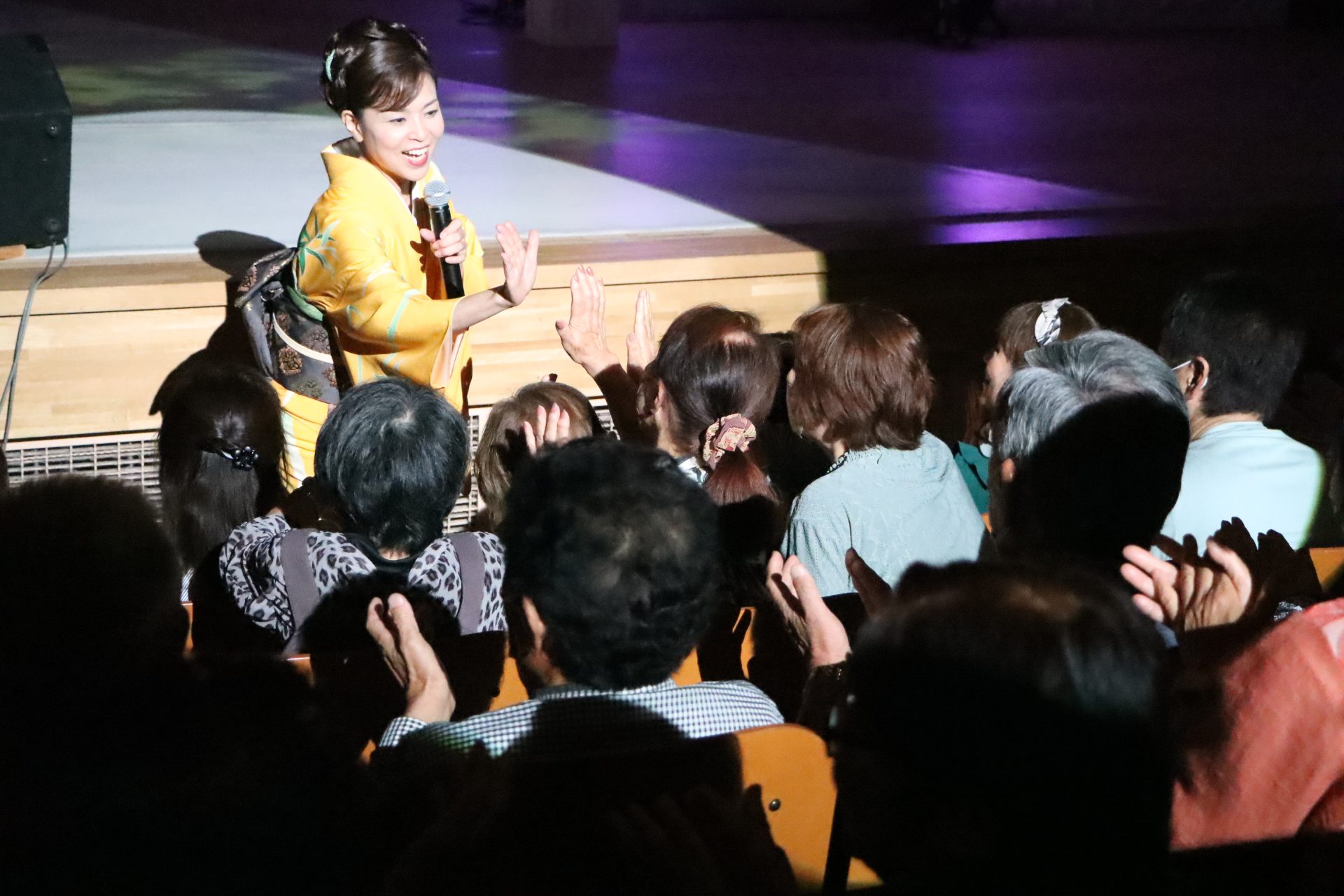 石原さんと田中さんは新曲の「風花岬」や「TATSUYA」など全15曲を披露。歌に合わせて客席へハイタッチをして回って盛り上がり、来場者は歌声とトークを楽しみました。
