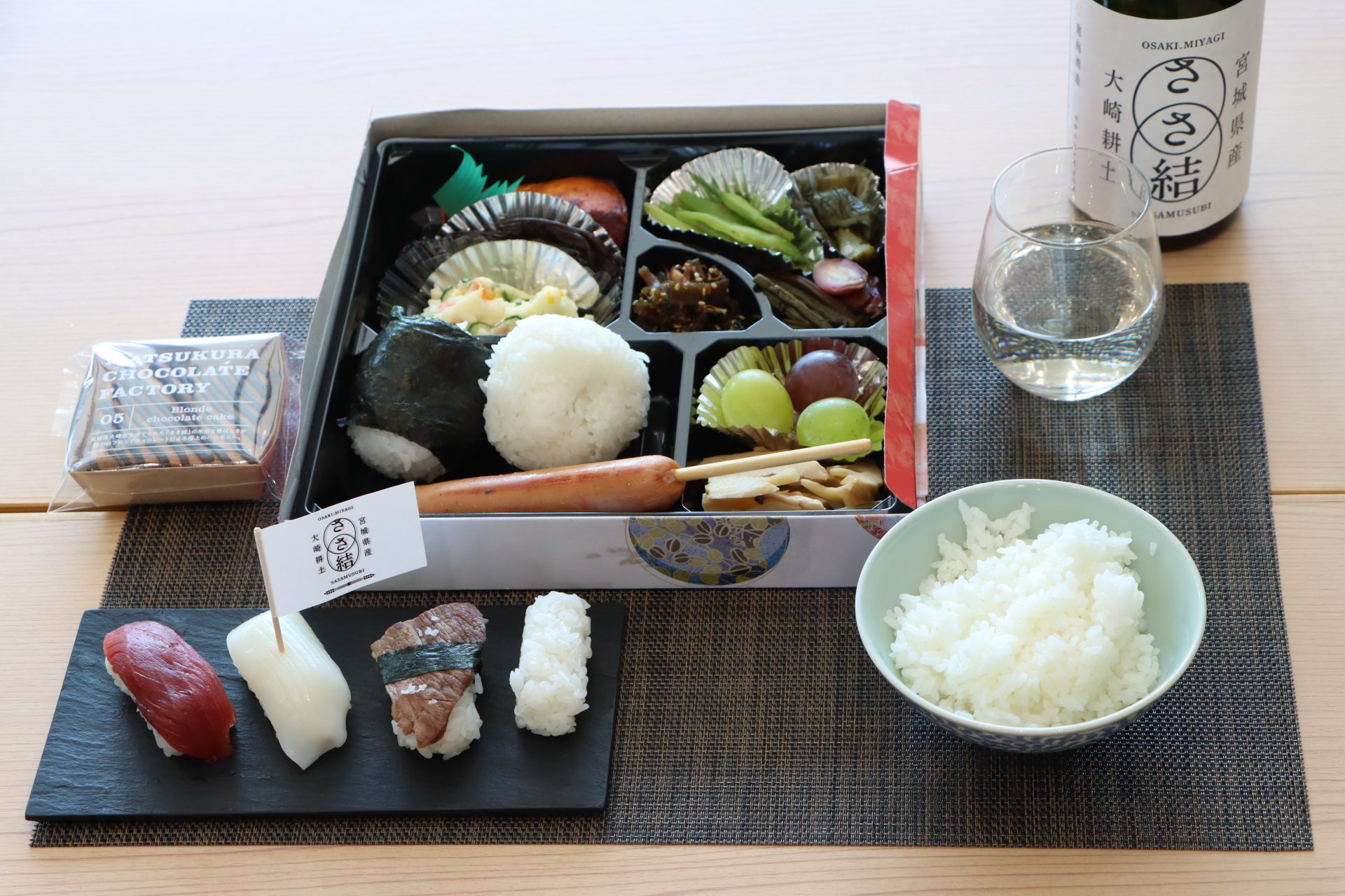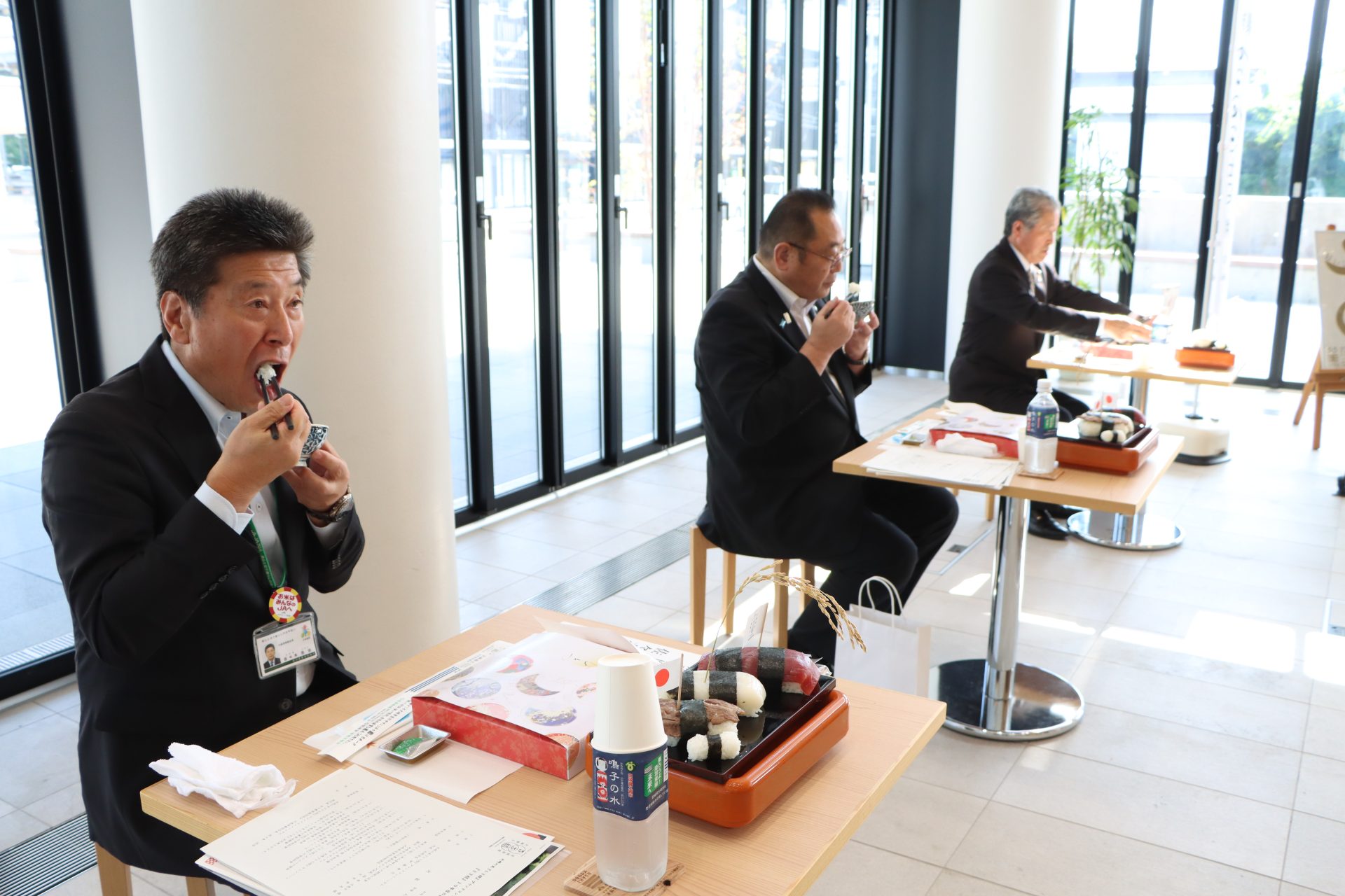 同コンソーシアム会員や関係機関の代表者らが出席。炊きたてご飯の他、鳥獣被害対策で捕獲したイノシシの肉を加工した「大崎ジビエフランク」や「大崎ジビエずし」などが振舞われました。