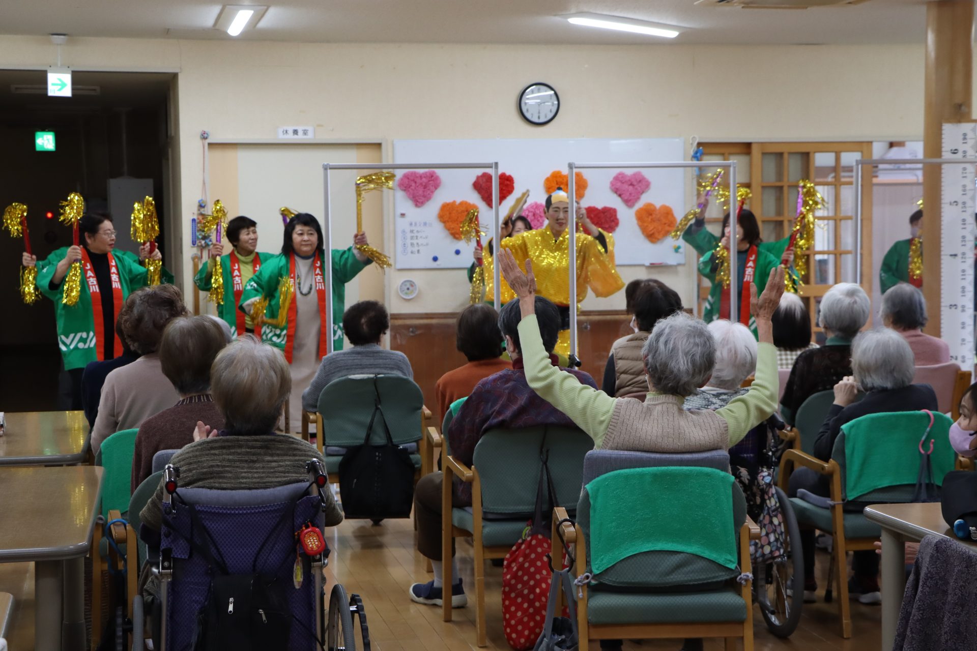同女性部の支部長ら12人がフラダンスや日本舞踊などを披露。着物で登場した際には「きれいな着物ね」と歓声が上がり、利用者は手拍子や、一緒に踊って楽しみました。