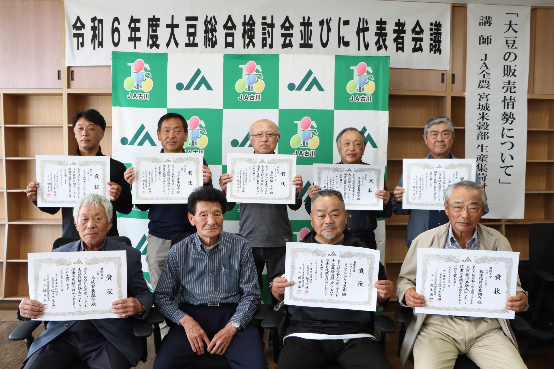 JAは5月20日、令和6年度大豆総合検討会を本店で開き「令和6年産ふるかわ大豆栽培共励会」の受賞団体を表彰しました。