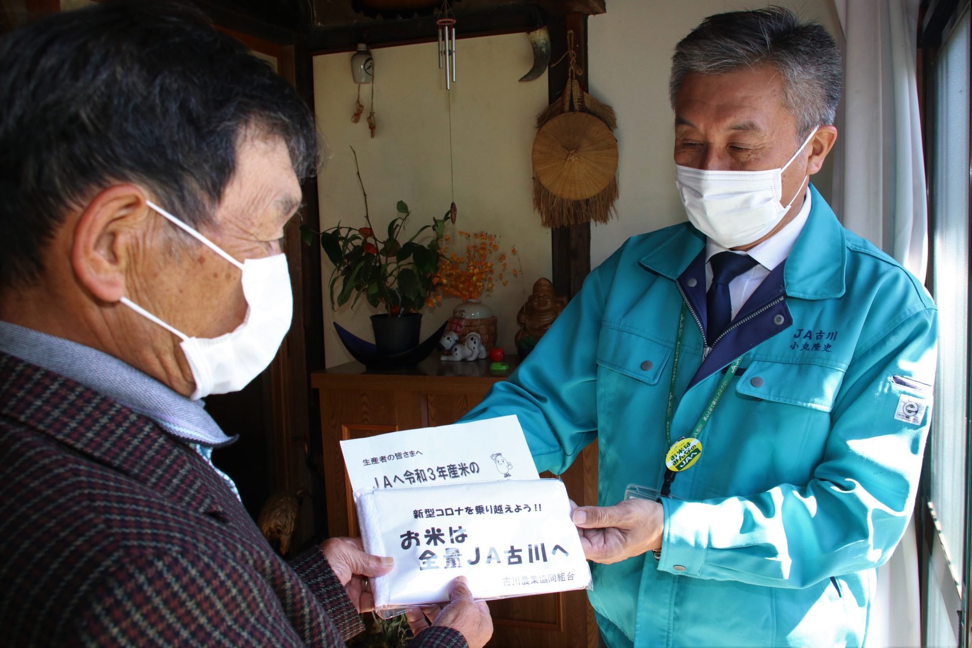 昨年に引き続き2回目の取り組みで、タオルには「新型コロナを乗り越えよう!お米は全量JA古川へ」と印字。10月の文書配付日に合わせて、職員が正組合員宅を1軒ずつ訪問しました。