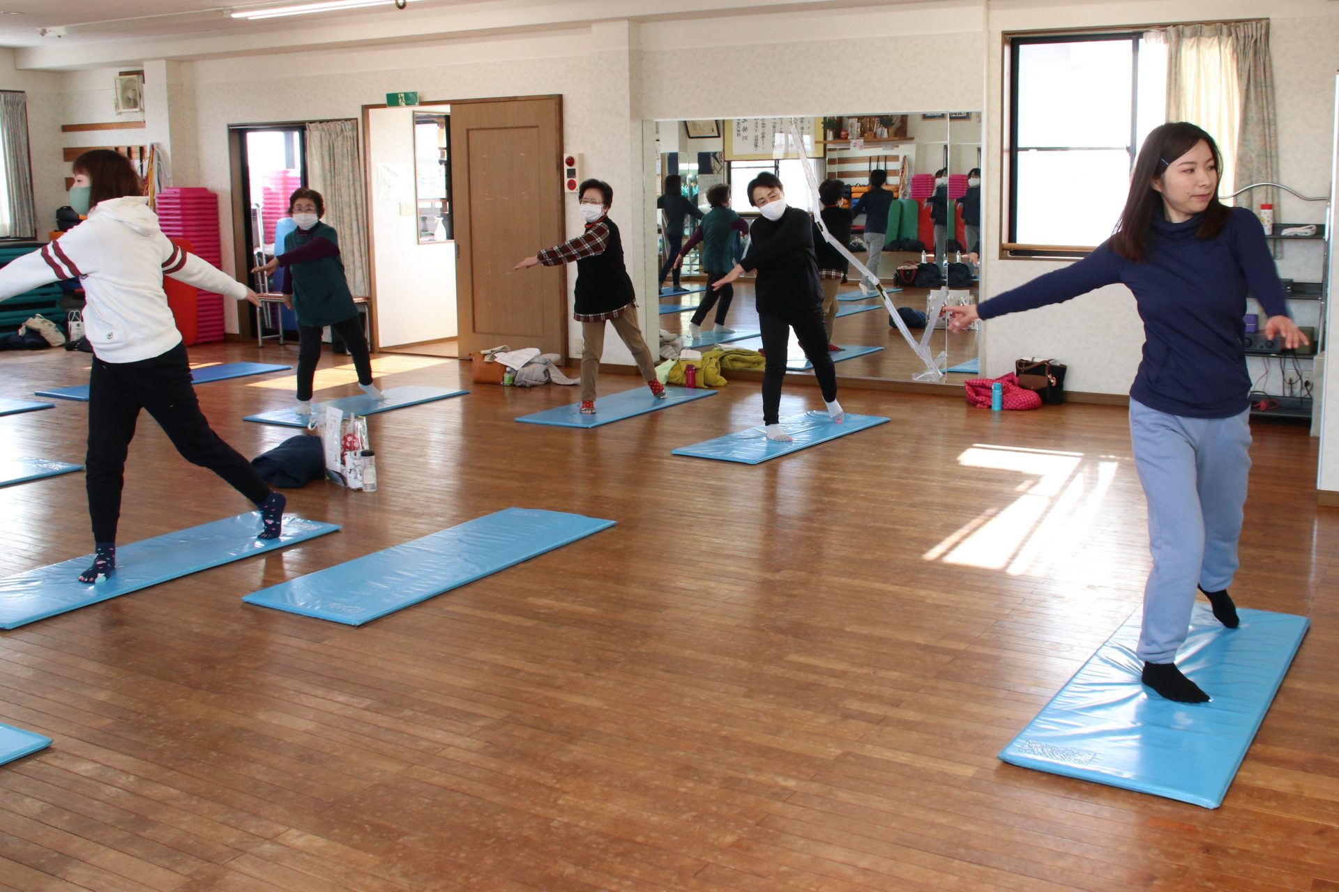 同ジムのインストラクター永塚いづみさんが指導。「筋肉は鍛えれば何歳になっても付く。筋肉は硬さと柔らかさのバランスが大切なので、鍛えるだけでなく、ストレッチでほぐすこと。疲労回復やストレス軽減効果もある」と話しました。