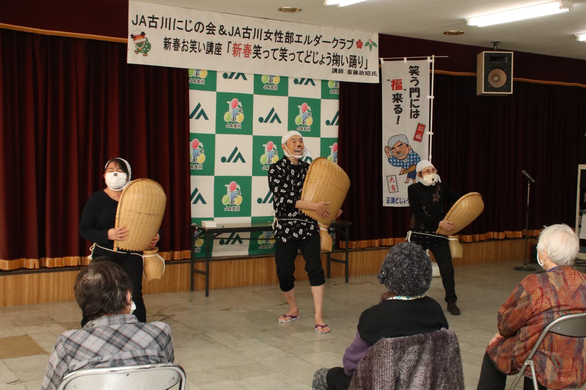 助け合い組織にじの会と女性部エルダークラブは1月25日、本店で合同の「新春お笑い講座」を開き、どじょう掬い踊りを学びました。