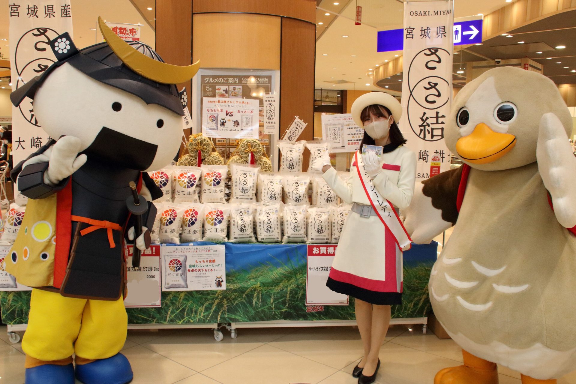店頭では、みやぎライシーレディやむすび丸、パタ崎さんがイベントを盛 り上げました