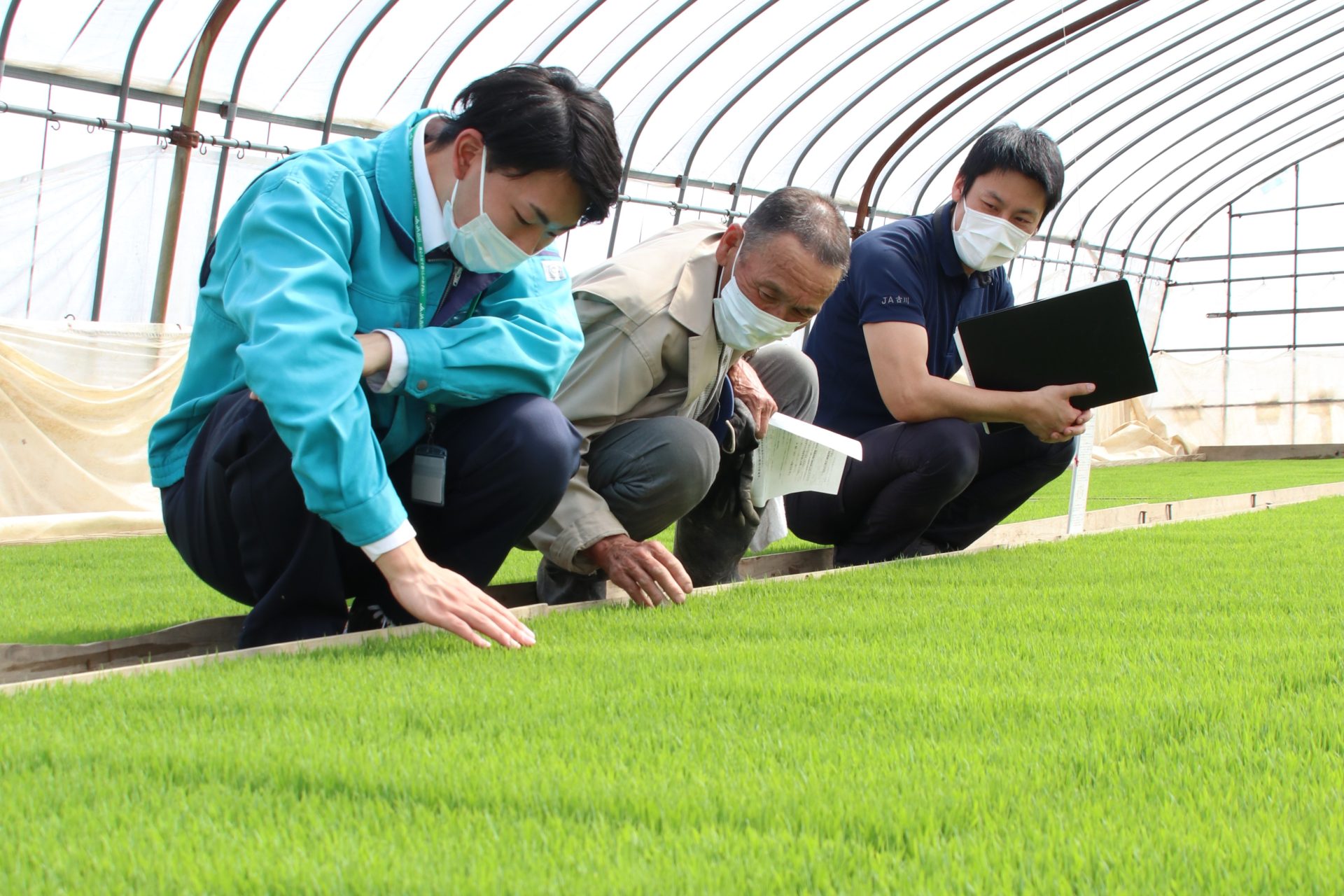 JAは4月11日から22日まで水稲の育苗巡回指導を行いました。営農担当職員が管内の育苗ハウスを訪れ、生育状況を確認。追肥のタイミングや温度管理などを指導しました。