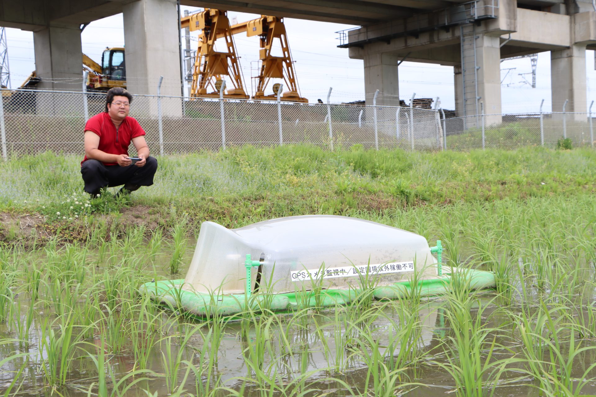アイガモロボは、ソーラー発電で稼働。GPSを利用して水田内を自動で進み、スマートフォンで遠隔操作でします。水中の泥を巻き上げることで水を濁らせ、雑草の成長を抑制することができます。