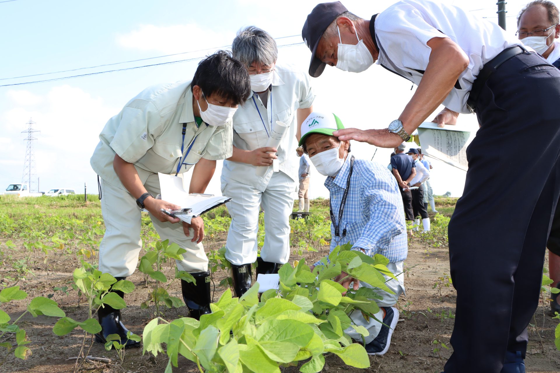JAは7月28日、古川富永地区で令和4年産大豆現地検討会を開きました。