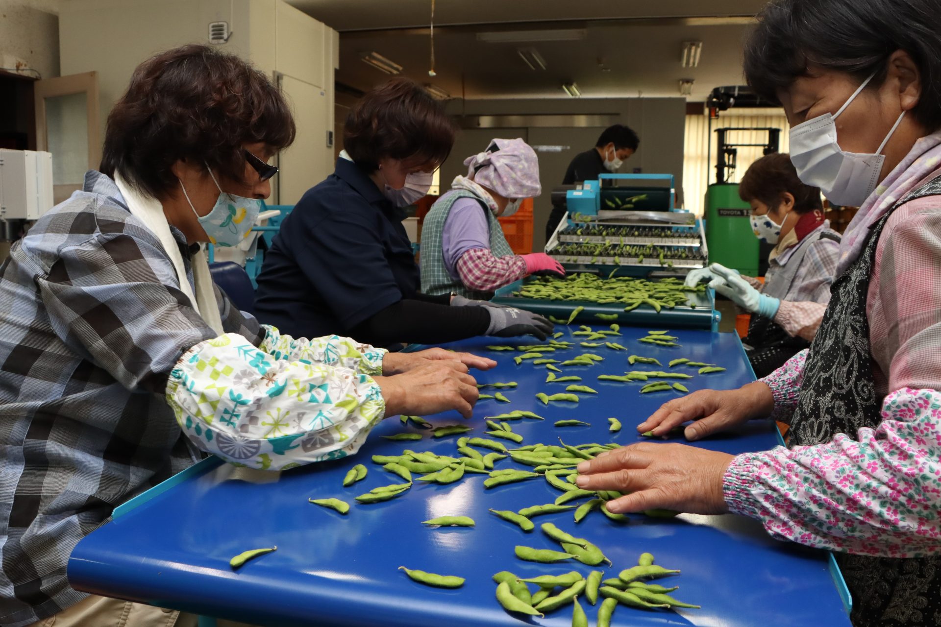 調整所では、生産者が機械で収穫したエダマメを共同で洗浄・選別し、生産者の作業省力化を図っています。9月下旬から収穫が始まる品種「秘伝」をメインに、収穫時期の異なる4品種のエダマメを需要のある時期に高単価で販売します。