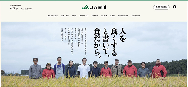 4月1日にJA古川のホームページを全面リニューアルしました。これまで掲載していた情報を整理し、知りたいことを探しやすくしたことで、より見やすく、親しみやすいものになりました。トップ画面には、管内の若手生産者と農産物を掲載。「若手農家の活躍」としてJA園芸振興会担い手部会「ぷらふる」の紹介ページも設けているほか、特産品紹介ページでも米や野菜、畜産の生産者を掲載し、フレッシュなイメージと生産者の活躍をPRしています。また、手軽に商品が購入できるよう、米や加工品は直接販売サイトへ行けるようになっています。スマートフォンでの閲覧にも対応しているので、小さな画面でも見やすく、ボタンも押しやすくなっています。